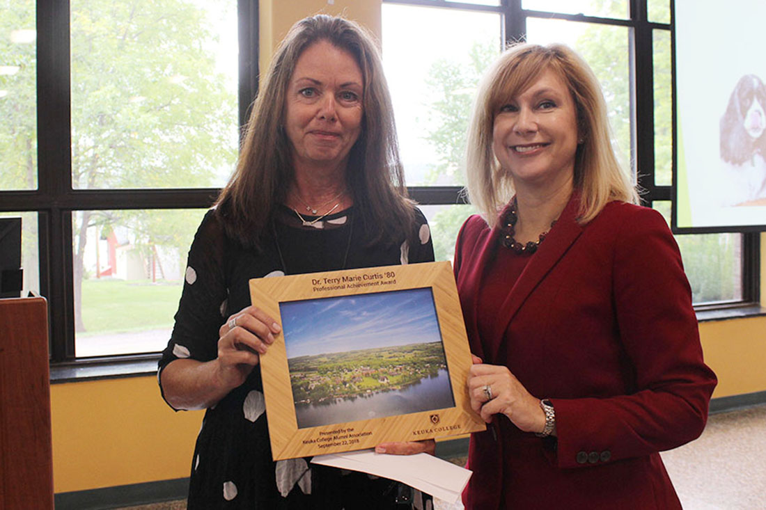 Helping pets and their human guardians stay together is one reason Dr. Curtis received this year’s Professional Achievement Award from the Keuka College Alumni Association. The award was presented during the annual Alumni Association breakfast, held during the College’s Green & Gold Celebration Weekend last month.