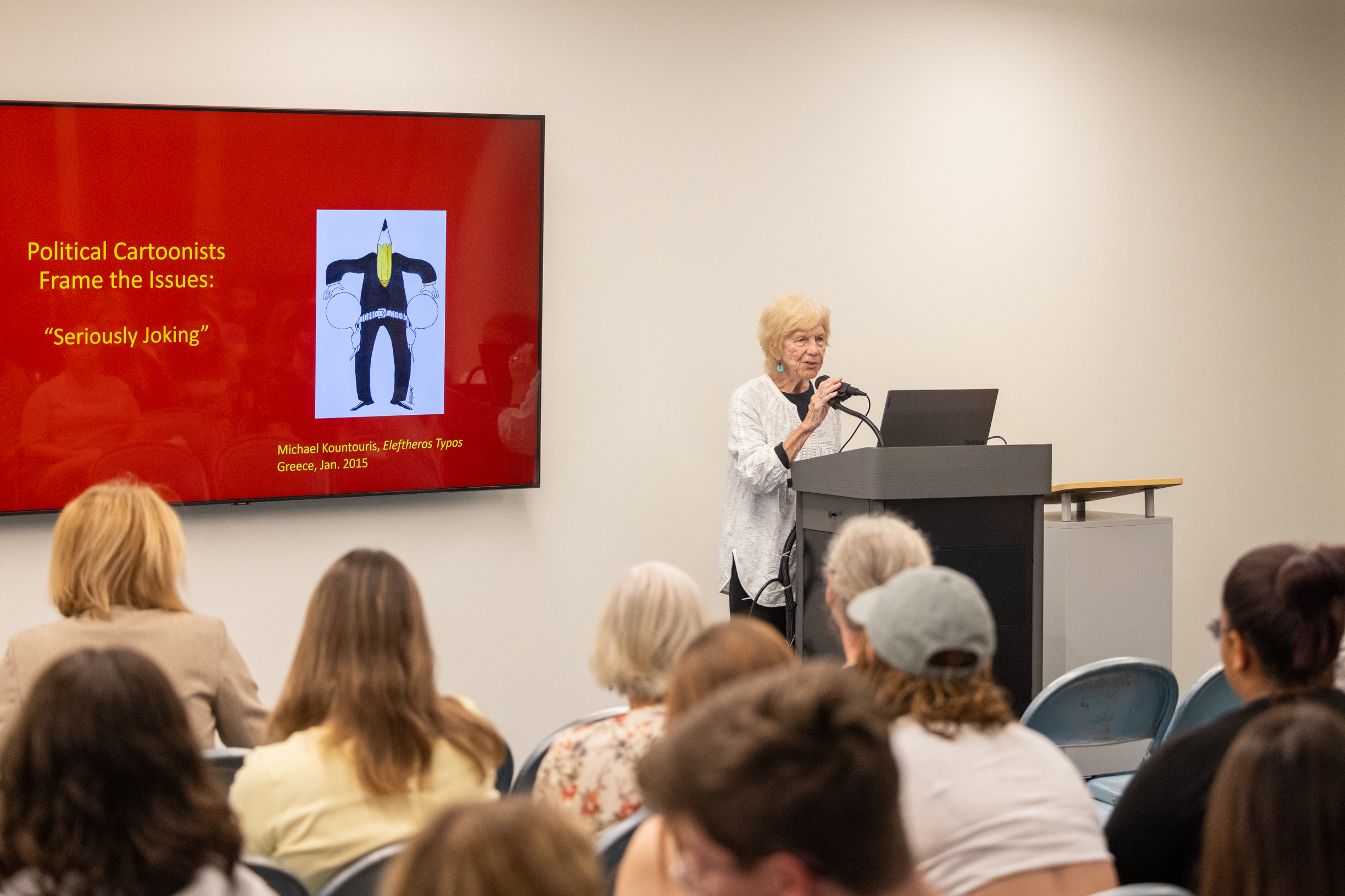 It stayed on Dr. Miller’s mind, however, and she went on to analyze how editorial cartoonists tackled gender issues with special emphasis on the treatment of former Secretary of State and 2016 presidential candidate Hillary Rodham Clinton – examples of which she shared.